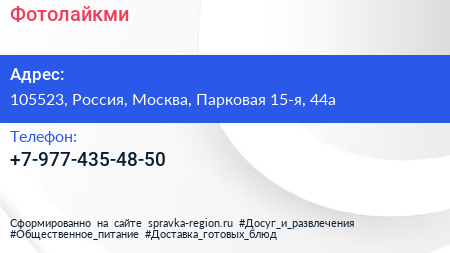 Фотолайкми по адресу 105523, Россия, Москва, Парковая 15-я, 44а в дальнейшем Организация, размещена в следующих категориях: