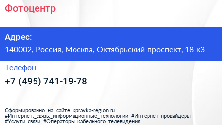Фотоцентр по адресу 140002, Россия, Москва, Октябрьский проспект, 18 к3 в дальнейшем Организация, размещена в следующих категориях: