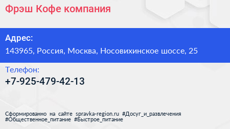 Фрэш Кофе, компания по адресу 143965, Россия, Москва, Носовихинское шоссе, 25 в дальнейшем Организация, размещена в следующих категориях: