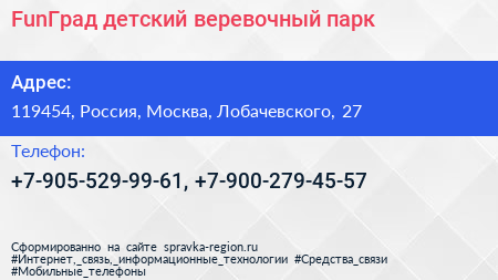 FunГрад, детский веревочный парк по адресу 119454, Россия, Москва, Лобачевского, 27 в дальнейшем Организация, размещена в следующих категориях: