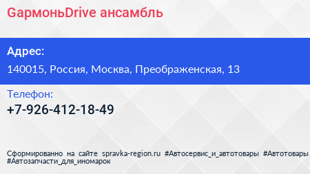 GармоньDrive, ансамбль по адресу 140015, Россия, Москва, Преображенская, 13 в дальнейшем Организация, размещена в следующих категориях: