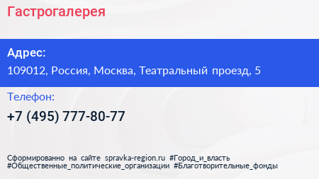 Гастрогалерея по адресу 109012, Россия, Москва, Театральный проезд, 5 в дальнейшем Организация, размещена в следующих категориях: