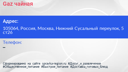 Gaz, чайная по адресу 105064, Россия, Москва, Нижний Сусальный переулок, 5 ст26 в дальнейшем Организация, размещена в следующих категориях: