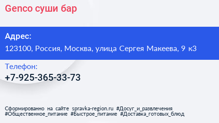 Genco, суши-бар по адресу 123100, Россия, Москва, улица Сергея Макеева, 9 к3 в дальнейшем Организация, размещена в следующих категориях: