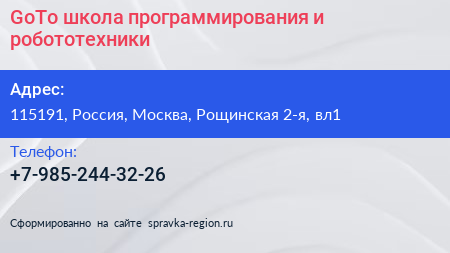 GoTo, школа программирования и робототехники по адресу 115191, Россия, Москва, Рощинская 2-я, вл1 в дальнейшем Организация, размещена в следующих категориях: