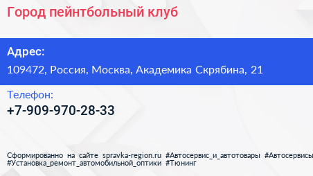 Город, пейнтбольный клуб по адресу 109472, Россия, Москва, Академика Скрябина, 21 в дальнейшем Организация, размещена в следующих категориях: