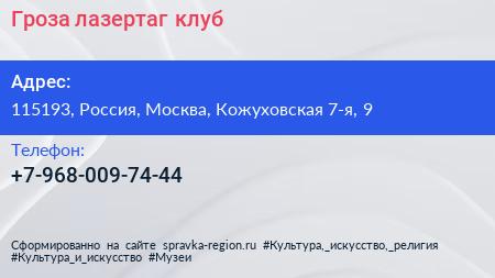 Гроза, лазертаг-клуб по адресу 115193, Россия, Москва, Кожуховская 7-я, 9 в дальнейшем Организация, размещена в следующих категориях: