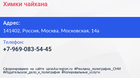 Химки, чайхана по адресу 141402, Россия, Москва, Московская, 14а в дальнейшем Организация, размещена в следующих категориях: