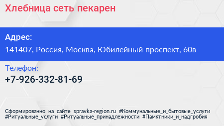 Хлебница, сеть пекарен по адресу 141407, Россия, Москва, Юбилейный проспект, 60в в дальнейшем Организация, размещена в следующих категориях: