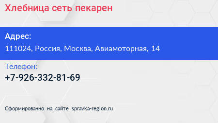 Хлебница, сеть пекарен по адресу 111024, Россия, Москва, Авиамоторная, 14 в дальнейшем Организация, размещена в следующих категориях: