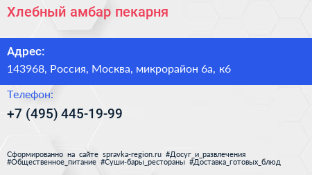Хлебный амбар, пекарня по адресу 143968, Россия, Москва, микрорайон 6а, к6 в дальнейшем Организация, размещена в следующих категориях: