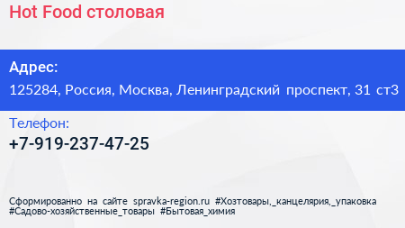 Hot Food, столовая по адресу 125284, Россия, Москва, Ленинградский проспект, 31 ст3 в дальнейшем Организация, размещена в следующих категориях: