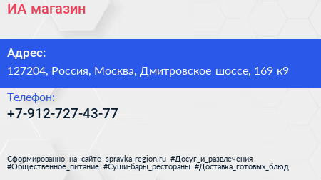 ИА, магазин по адресу 127204, Россия, Москва, Дмитровское шоссе, 169 к9 в дальнейшем Организация, размещена в следующих категориях: