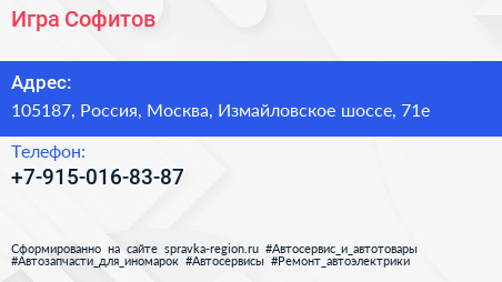 Игра Софитов по адресу 105187, Россия, Москва, Измайловское шоссе, 71е в дальнейшем Организация, размещена в следующих категориях: