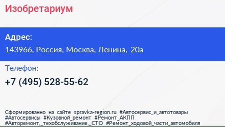 Изобретариум по адресу 143966, Россия, Москва, Ленина, 20а в дальнейшем Организация, размещена в следующих категориях: