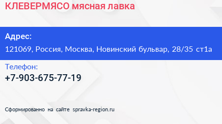 КЛЕВЕРМЯСО, мясная лавка по адресу 121069, Россия, Москва, Новинский бульвар, 28/35 ст1а в дальнейшем Организация, размещена в следующих категориях: