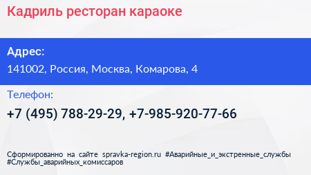 Кадриль, ресторан-караоке по адресу 141002, Россия, Москва, Комарова, 4 в дальнейшем Организация, размещена в следующих категориях: