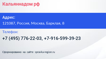 Кальяннадом.рф по адресу 121087, Россия, Москва, Барклая, 8 в дальнейшем Организация, размещена в следующих категориях: