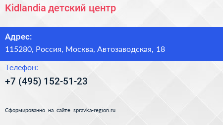 Kidlandia, детский центр по адресу 115280, Россия, Москва, Автозаводская, 18 в дальнейшем Организация, размещена в следующих категориях: