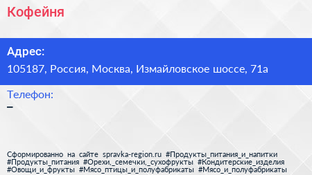 Кофейня по адресу 105187, Россия, Москва, Измайловское шоссе, 71а в дальнейшем Организация, размещена в следующих категориях: