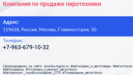 Компания по продаже пиротехники по адресу 119618, Россия, Москва, Главмосстроя, 10 в дальнейшем Организация, размещена в следующих категориях: