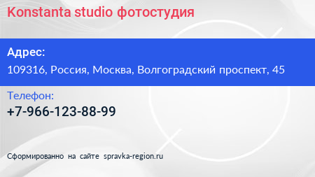 Konstanta-studio, фотостудия по адресу 109316, Россия, Москва, Волгоградский проспект, 45 в дальнейшем Организация, размещена в следующих категориях: