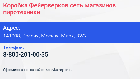 Коробка Фейерверков, сеть магазинов пиротехники по адресу 141008, Россия, Москва, Мира, 32/2 в дальнейшем Организация, размещена в следующих категориях: