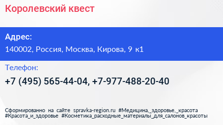 Королевский квест по адресу 140002, Россия, Москва, Кирова, 9 к1 в дальнейшем Организация, размещена в следующих категориях: