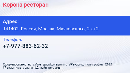 Корона, ресторан по адресу 141402, Россия, Москва, Маяковского, 2 ст2 в дальнейшем Организация, размещена в следующих категориях: