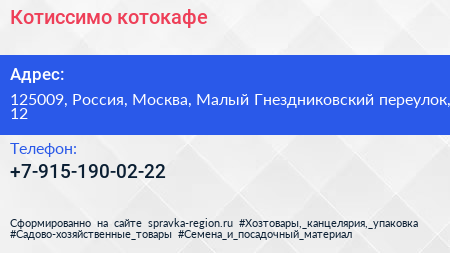 Котиссимо, котокафе по адресу 125009, Россия, Москва, Малый Гнездниковский переулок, 12 в дальнейшем Организация, размещена в следующих категориях: