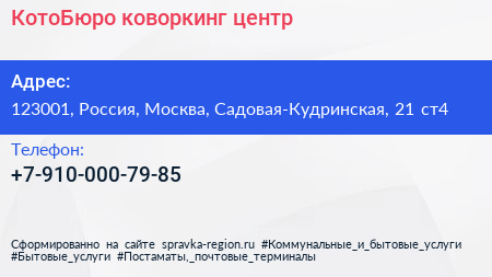 КотоБюро, коворкинг-центр по адресу 123001, Россия, Москва, Садовая-Кудринская, 21 ст4 в дальнейшем Организация, размещена в следующих категориях: