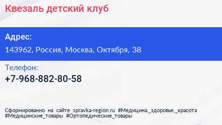 Квезаль, детский клуб по адресу 143962, Россия, Москва, Октября, 38 в дальнейшем Организация, размещена в следующих категориях: