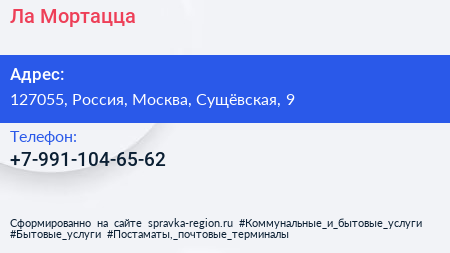 Ла Мортацца по адресу 127055, Россия, Москва, Сущёвская, 9 в дальнейшем Организация, размещена в следующих категориях: