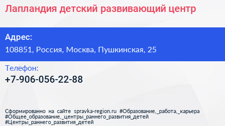 Лапландия, детский развивающий центр по адресу 108851, Россия, Москва, Пушкинская, 25 в дальнейшем Организация, размещена в следующих категориях: