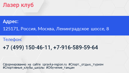 Лазер клуб по адресу 125171, Россия, Москва, Ленинградское шоссе, 8 в дальнейшем Организация, размещена в следующих категориях: