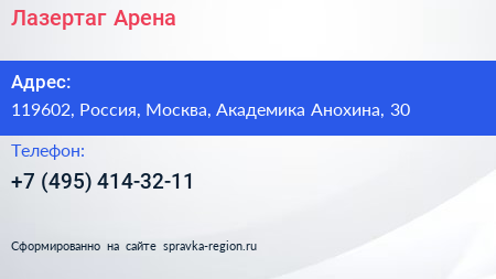 Лазертаг Арена по адресу 119602, Россия, Москва, Академика Анохина, 30 в дальнейшем Организация, размещена в следующих категориях: