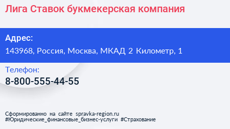 Лига Ставок, букмекерская компания по адресу 143968, Россия, Москва, МКАД 2 Километр, 1 в дальнейшем Организация, размещена в следующих категориях: