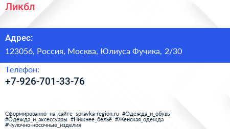 Ликбл по адресу 123056, Россия, Москва, Юлиуса Фучика, 2/30 в дальнейшем Организация, размещена в следующих категориях: