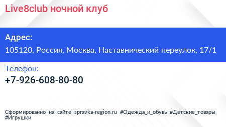 Live8club, ночной клуб по адресу 105120, Россия, Москва, Наставнический переулок, 17/1 в дальнейшем Организация, размещена в следующих категориях: