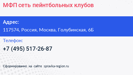 МФП, сеть пейнтбольных клубов по адресу 117574, Россия, Москва, Голубинская, 6Б в дальнейшем Организация, размещена в следующих категориях: