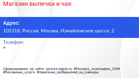 Магазин выпечки и чая по адресу 105318, Россия, Москва, Измайловское шоссе, 2 в дальнейшем Организация, размещена в следующих категориях: