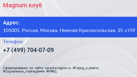 Magnum, клуб по адресу 105005, Россия, Москва, Нижняя Красносельская, 35 ст59 в дальнейшем Организация, размещена в следующих категориях:
