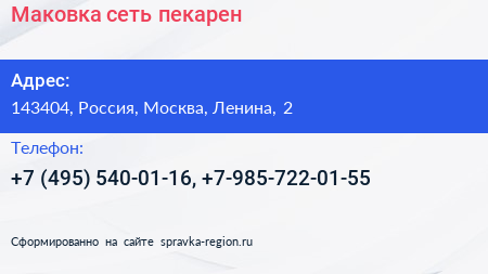 Маковка, сеть пекарен по адресу 143404, Россия, Москва, Ленина, 2 в дальнейшем Организация, размещена в следующих категориях:
