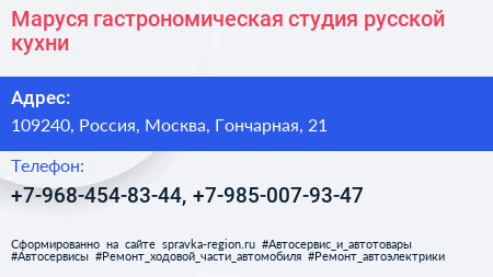Маруся, гастрономическая студия русской кухни по адресу 109240, Россия, Москва, Гончарная, 21 в дальнейшем Организация, размещена в следующих категориях:
