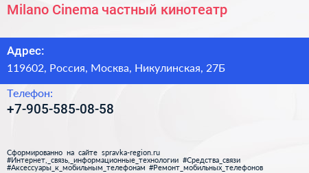 Milano Cinema, частный кинотеатр по адресу 119602, Россия, Москва, Никулинская, 27Б в дальнейшем Организация, размещена в следующих категориях: