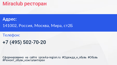Miraclub, ресторан по адресу 141002, Россия, Москва, Мира, ст2Б в дальнейшем Организация, размещена в следующих категориях: