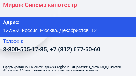 Мираж Синема, кинотеатр по адресу 127562, Россия, Москва, Декабристов, 12 в дальнейшем Организация, размещена в следующих категориях: