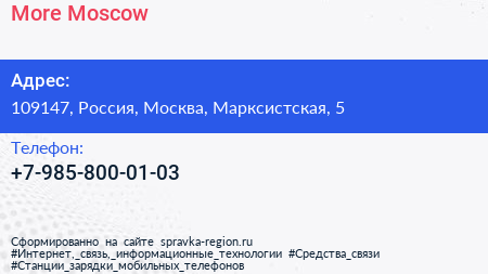 More Moscow по адресу 109147, Россия, Москва, Марксистская, 5 в дальнейшем Организация, размещена в следующих категориях: