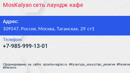 MosKalyan, сеть лаундж-кафе по адресу 109147, Россия, Москва, Таганская, 29 ст1 в дальнейшем Организация, размещена в следующих категориях: