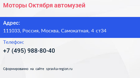 Моторы Октября, автомузей по адресу 111033, Россия, Москва, Самокатная, 4 ст34 в дальнейшем Организация, размещена в следующих категориях: